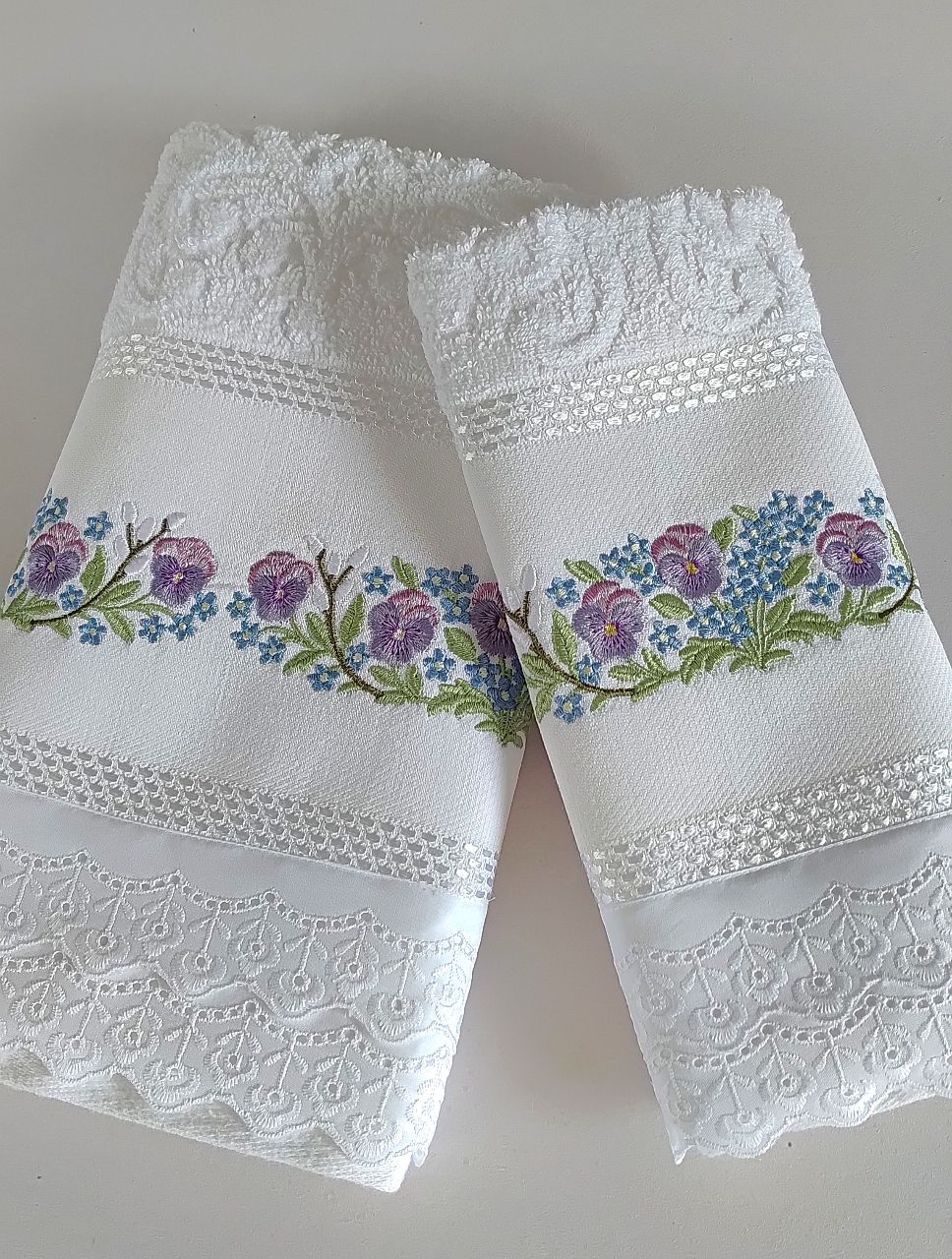 Este jogo traz duas toalhas em branco clássico, com bordado inglês duplo e delicados amor-perfeito para embelezar banheiros e lavabos.