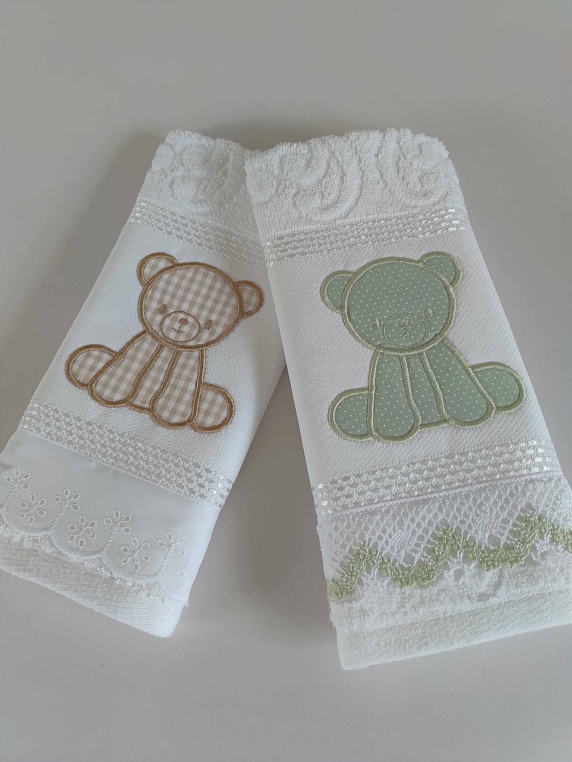 Delicadeza na aplicação de ursinho em tons suaves nesse kit de toalhinhas de boca ou ombro para acompanhar seu bebê.