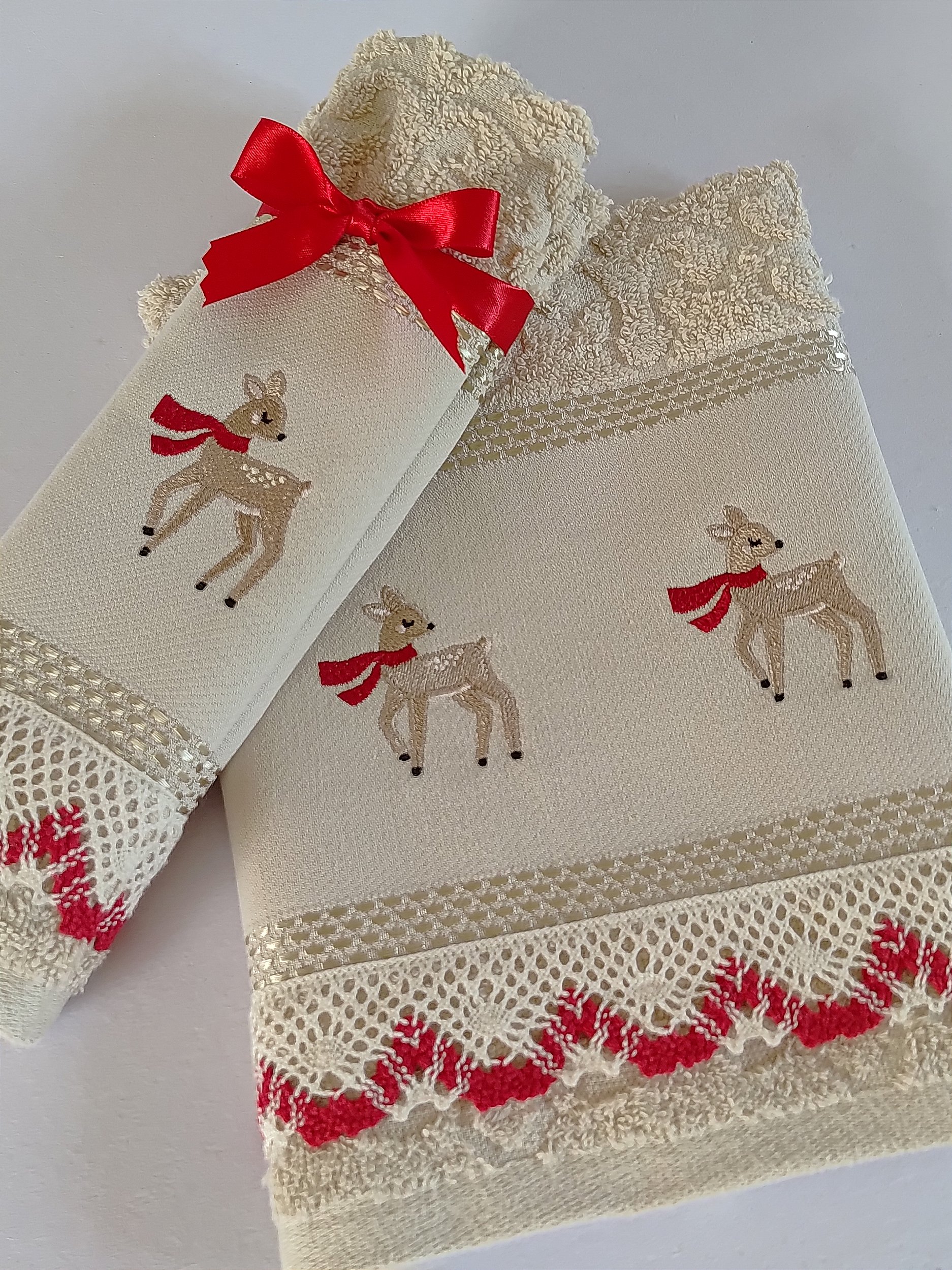 Toalha de Natal com bordado tom sobre tom trazendo a delicadeza de um cervo para encantar sua decoração natalina.