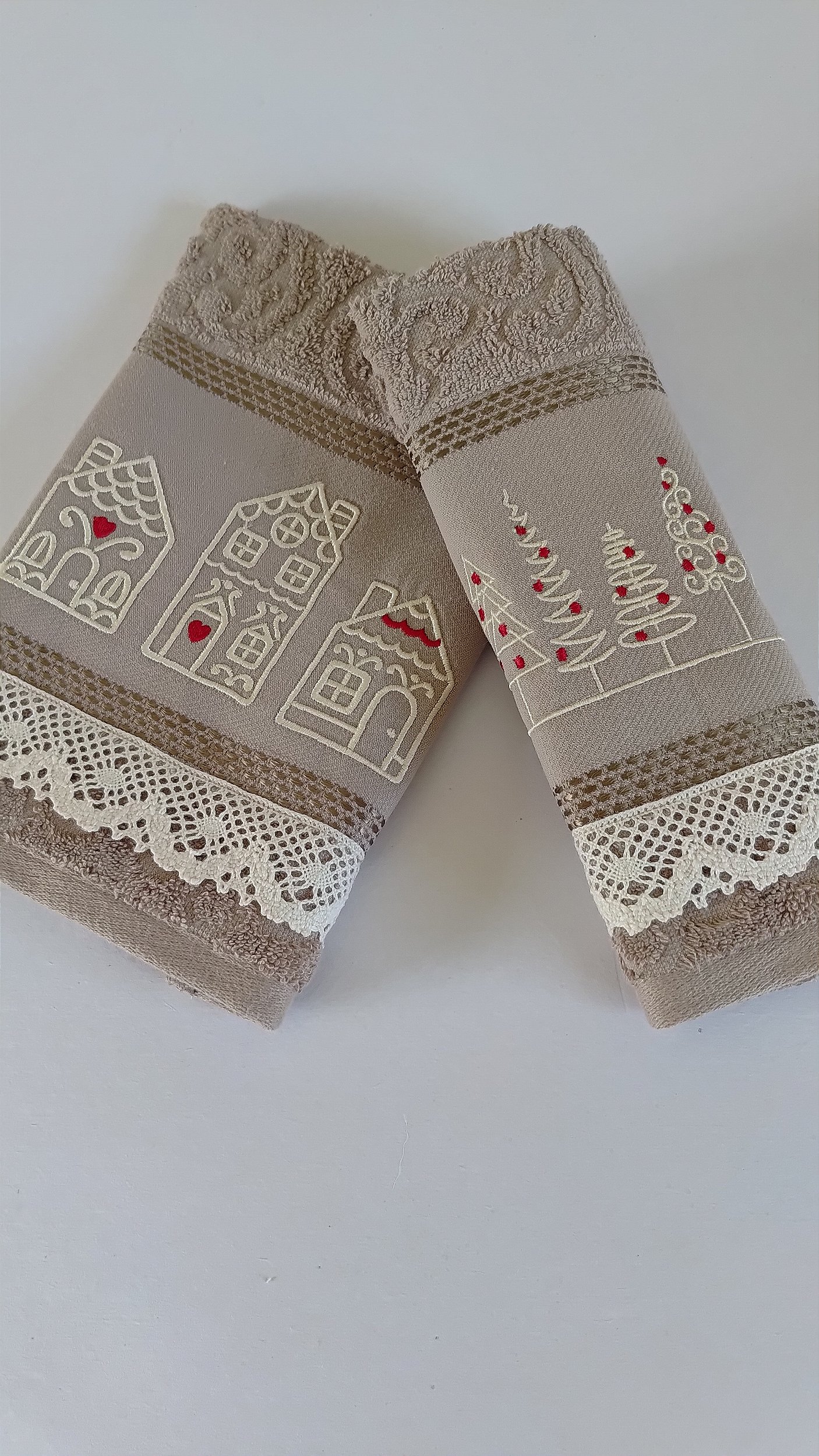 Nossas toalhas natalinas chegam com bordados delicados: casinhas encantadoras, arvorezinhas festivas e toques em vermelho que iluminam cada detalhe.