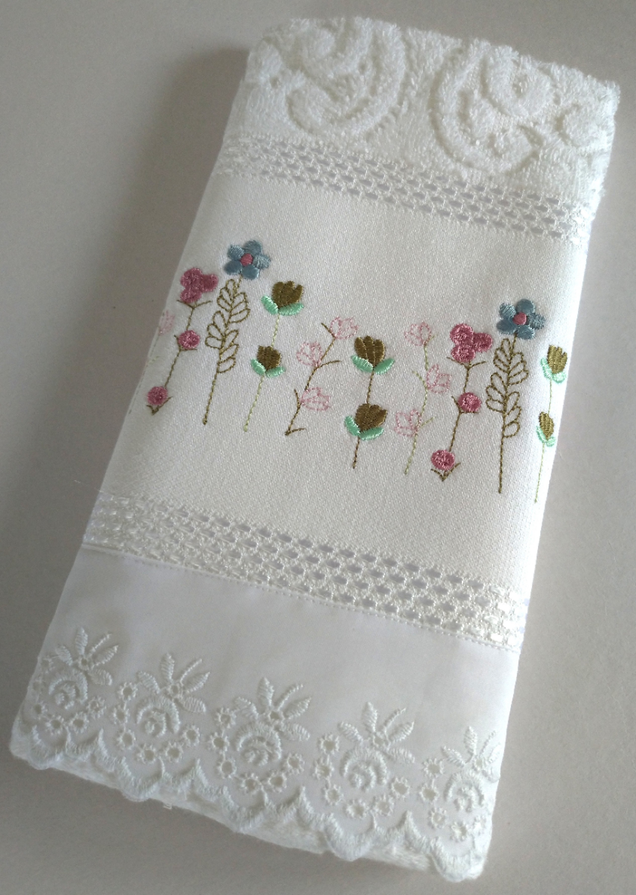 As pequenas e delicadas florzinhas bordadas em uma toalha de lavabo acrescenta um toque de elegância ao banheiro.